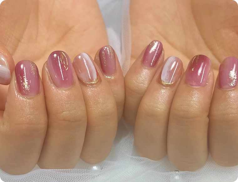ジェルネイルで一番シンプルな仕上がりで初めての方にもおすすめなメニューです。ナチュラルなベージュやピンクは肌になじむのでお手元が上品に見えます。赤などの濃いカラーは高級感が出て小さな爪にもとても合います。カラーにお悩みの方はネイリストが似合うお色をご提案いたします。